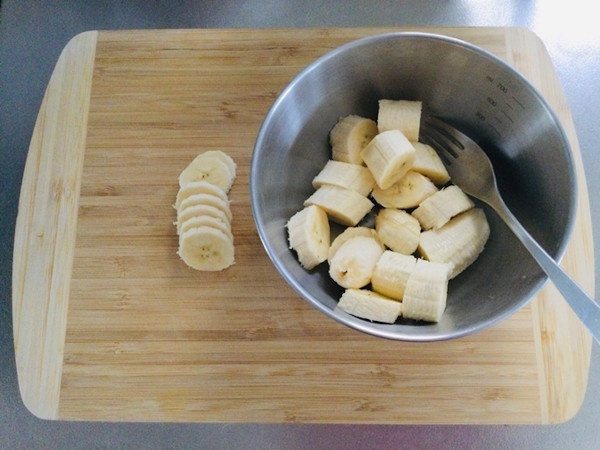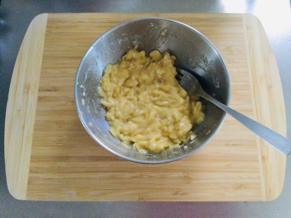 3.ボールに入れたバナナをフォークの背で潰します。