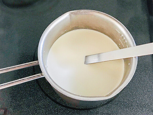 1.小鍋に豆乳、生クリーム、メープルシロップを入れて、弱火〜中火でかき混ぜながら温めます。