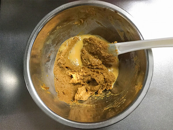 2.溶き卵と米粉&ベーキングパウダーを交互に3回くらいに分けて加えながら、都度混ぜます。