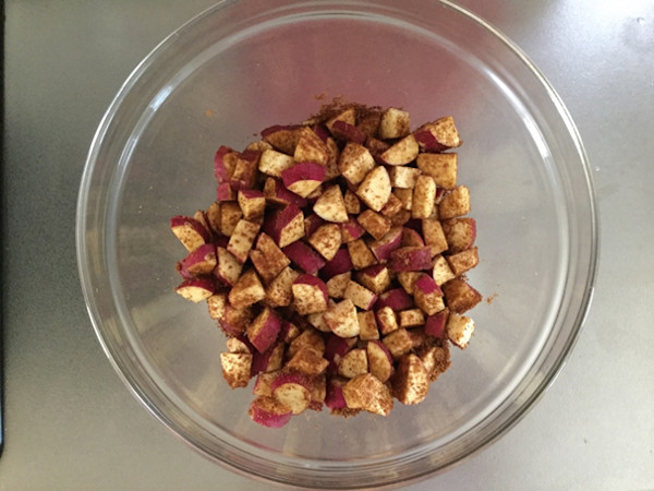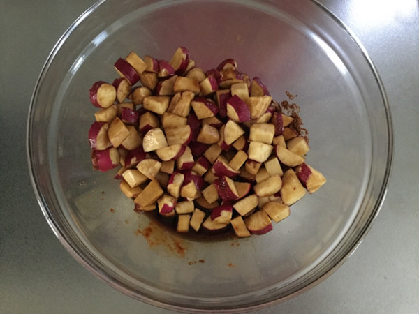 1.サツマイモを1cmに角切りして、しばらく水にさらし、よく洗って、水を切ります。 (こちらは有機のサツマイモなので皮付きのままですが、そうでない場合は皮は剥いた方がよいと思います)