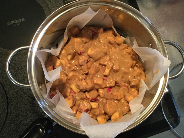 5.蒸し器にキッチンペーパーを敷いて、一気に流し入れ、蓋をして30分間蒸します。