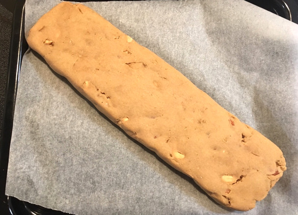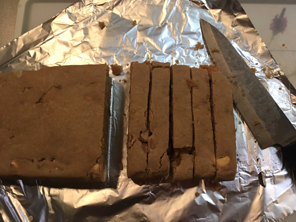 4.オーブンから出して、4,5分冷ましたら、0.7~1㎝程にカットします。柔らかくて崩れやすいので気を付けて下さい。(ナッツも柔らかくなっているので包丁が入りやすいです)その後、150度のオーブンで片面20分ずつ、合計40分焼きます。
