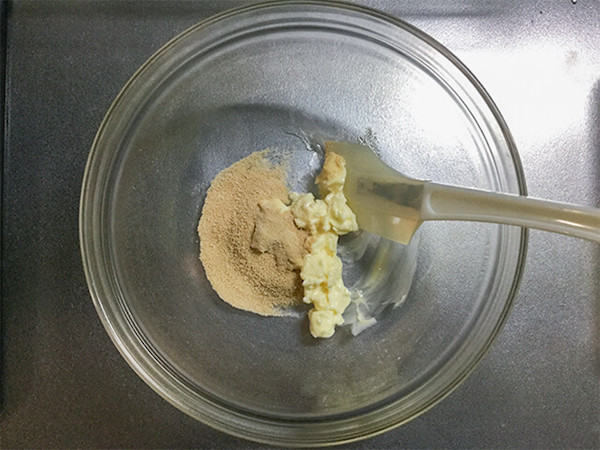 1.室温で柔らかくしたバターにメープルシュガーを入れて混ぜます。