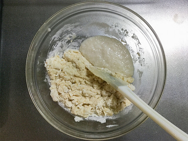 3.米粉、アーモンド粉、ベーキングパウダーを加えて混ぜ、更に甘酒を加えて混ぜます。