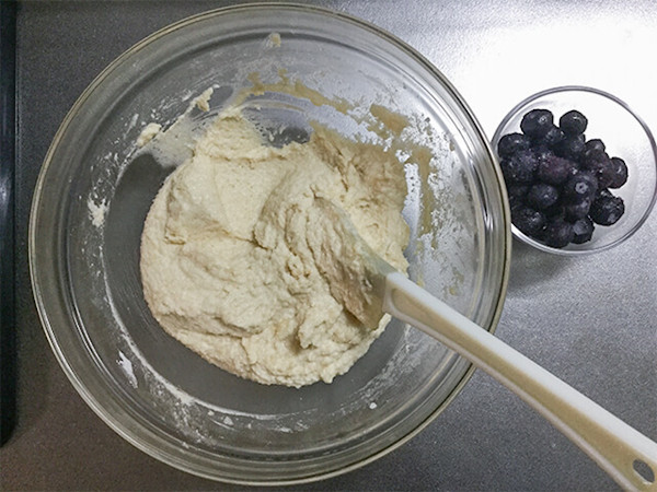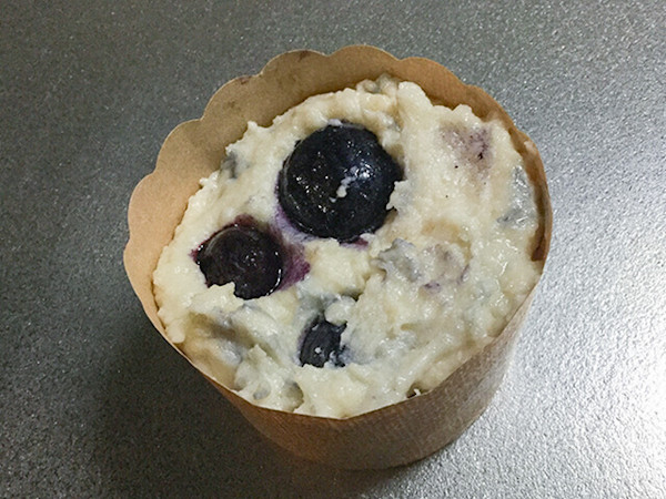 4.ブルーベリーを準備します。マフィンの型に生地とブルーベリー3粒ほどを交互に三層ほど入れていきます。