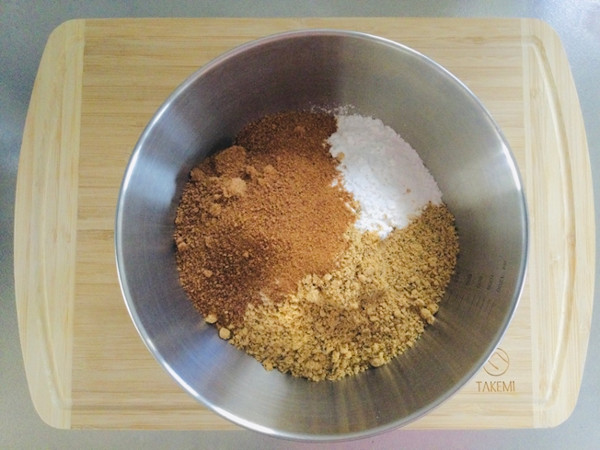 1.米粉、アーモンド粉、きな粉黒胡麻、ココナッツシュガーをボールで混ぜます。