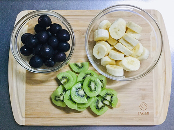 今回はバナナ(意外とオススメです。酸味のあるフルーツと合います)、キウイフルーツ、アメリカンチェリーを入れました。