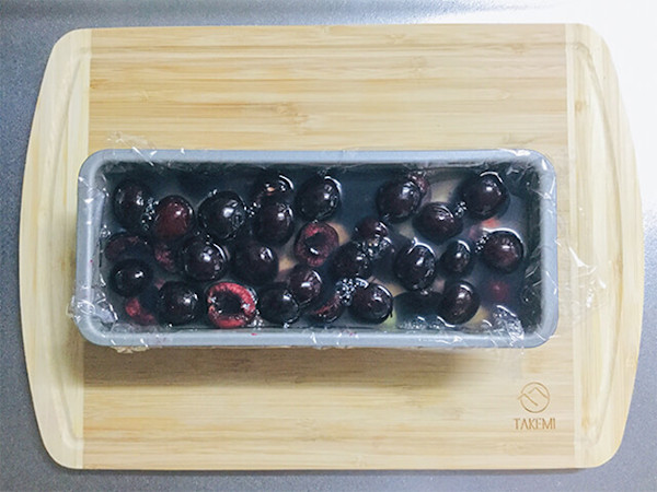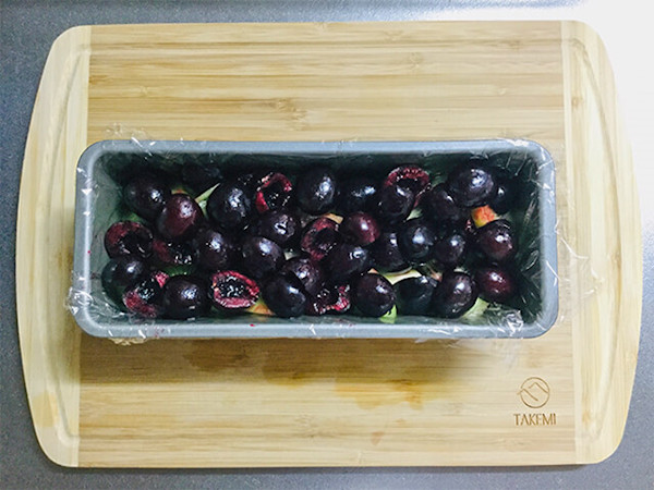 3.パウンド型にラップを敷いて、フルーツを重いものから順に入れていきます。今回はバナナ→キウイ→チェリーです。