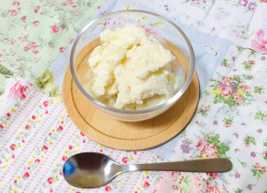 完全に凍らせないで、半分凍ったところでよく混ぜてクリーム状にするのがポイントです。