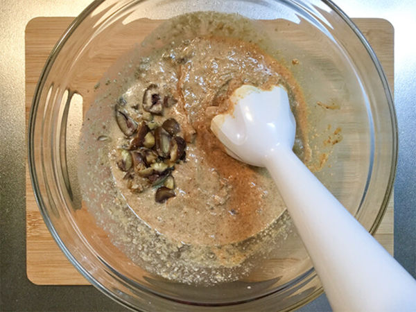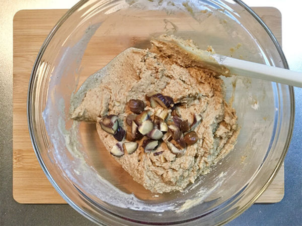 2.甘栗180gを刻んで投入し、ブレンダーでペースト状に練ります。(フードプロセッサーで粉状にしてから生地に加えてまぜても良いです)
