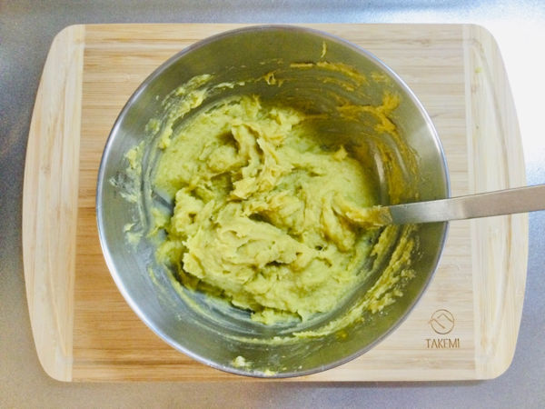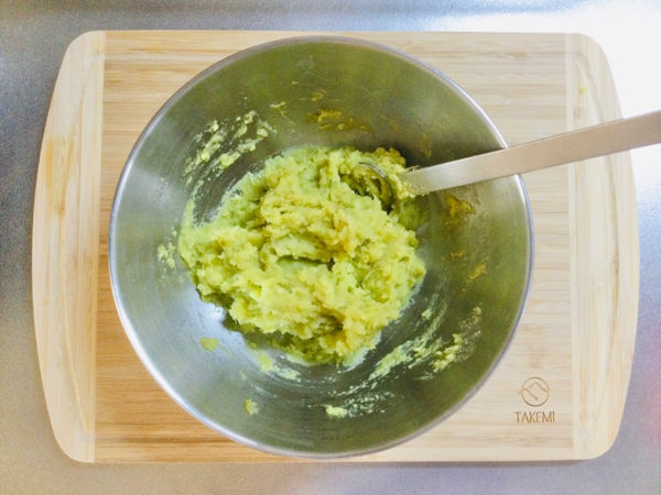 1.蒸した(茹でた)さつまいもを熱いうちに皮を剥いで潰して、バターを溶かし混ぜます。