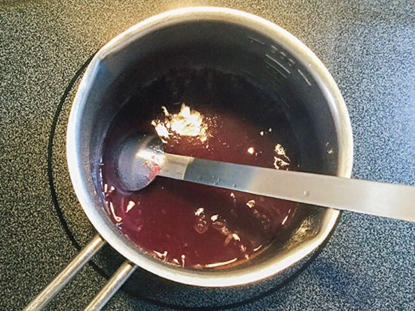 1.ジュースを小鍋で煮て、ゼラチン 、レモン汁を加えて半分の量まで煮詰めます。ゼラチンは完全に溶かしましょう。