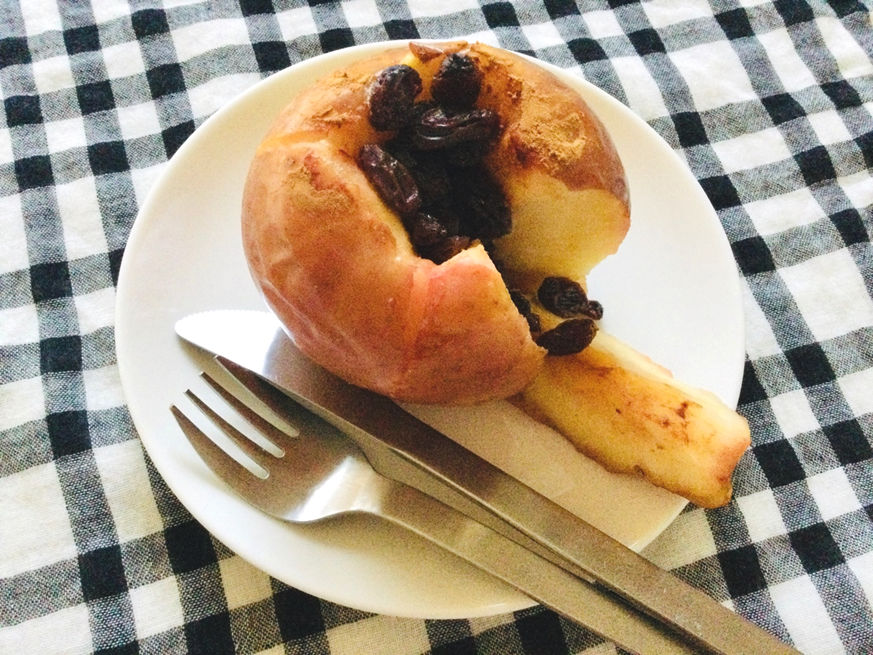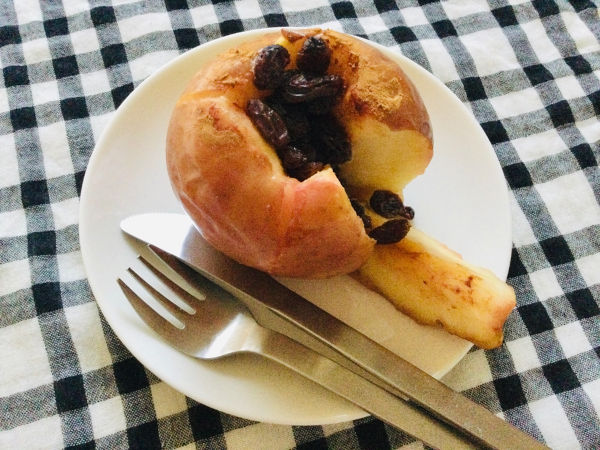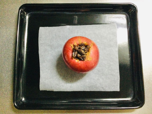 芯をくり抜いた穴には、鉄分豊富なレーズンを詰め込んで下さい。りんご果汁を吸って柔らかくなりますよ。