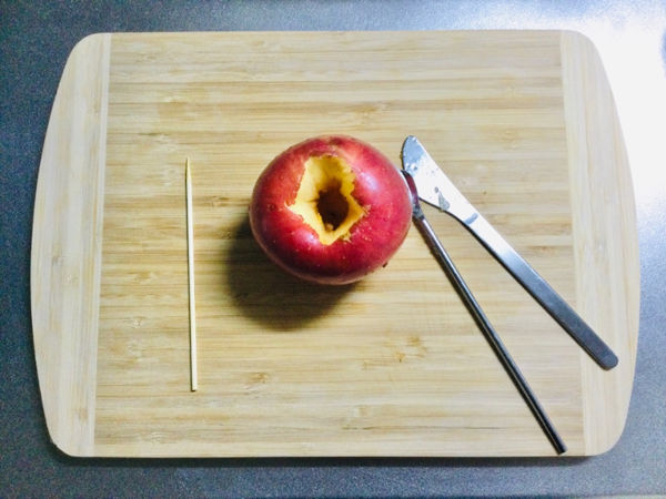 1.細めのナイフやスプーンを使ってりんごの芯を取る。下まで貫通しないよう気をつける。また、りんごが破裂するのを防ぐために、竹串を表面に数カ所刺して穴をあけておく。