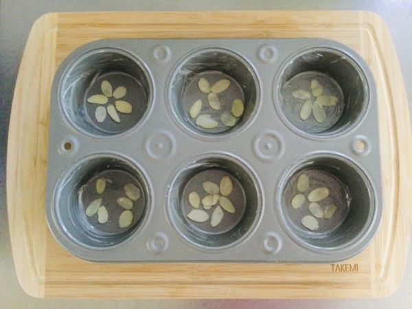 3.マフィン型にバター(分量外)を塗り、アーモンドスライスを張り付けます。