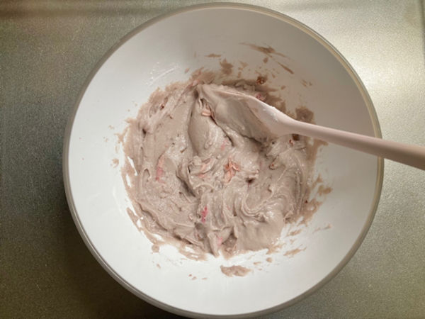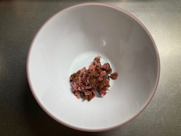 1.桜の花は塩抜きをして水気をとり、トッピングに使うもの(全体の1/3くらい)を除いて細かく刻みます。