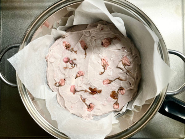 4.蒸し器にクッキングペーパーを敷いて(ぐちゃっとなっても大丈夫なので蒸し器の形に合わせる)、3を入れてトッピングの桜の花を乗せ、強めの火で20~25分蒸して完成です。
