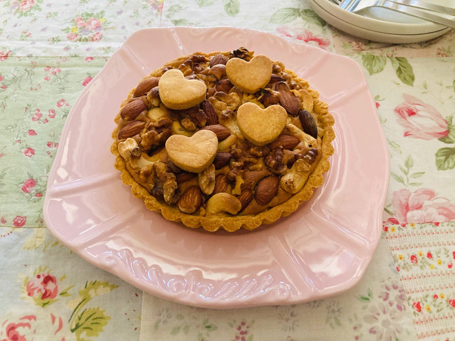 6.焼き上がったタルト生地に5を流し込み、ミックスナッツを敷き詰めて、180度予熱のオーブンで17〜20分ほど焼いたら完成です。