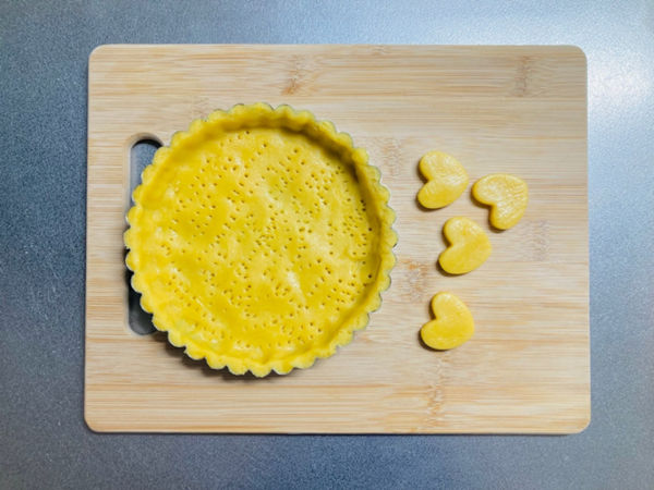 3.型に薄く米油を塗っておきます。2の生地をラップに包んで、手で薄く平らに押し広げて、型に合わせて貼り付けます。底面はフォークで穴を開けます。170度予熱オーブンで15〜20分焼き魔ます。余った生地はクッキーにして一緒に焼きます。