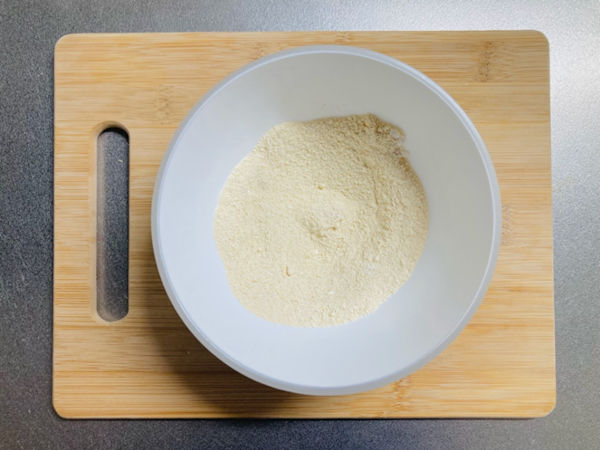 4.焼いている間にアーモンドクリームを作ります。アーモンドプードル、米粉、メープルシュガー、ベーキングパウダーをボウルに入れてよく混ぜます。