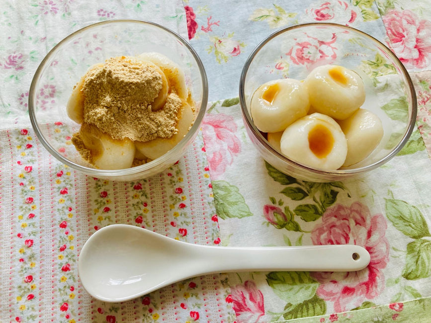4.冷えた白玉の水気を切り、器に盛り付け、タレやきな粉をかけて完成です。盛り付ける前に冷蔵庫で冷やすとより美味しいです。