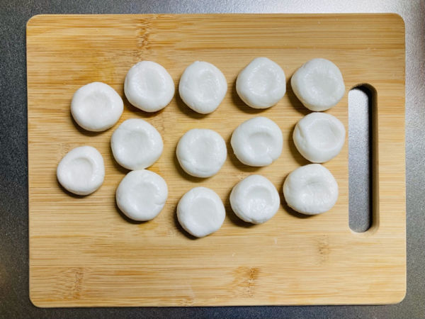 2.ひと口大に丸めて、真ん中を少しくぼませます。(くぼませることで火の通りはがよくなります。)