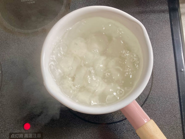 3.沸騰したお湯に入れて、浮かび上がってくるまで茹でて、冷水で冷やします。一方で、タレの材料を小鍋で熱するか、耐熱ボウルなどに入れて電子レンジで温めて、冷まします。