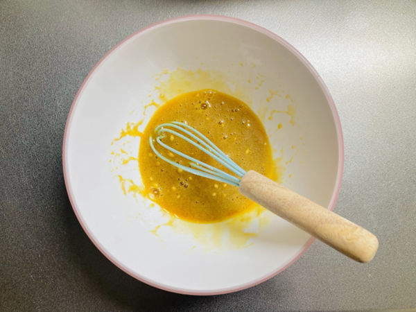 1.ボウルで卵を溶き、メープルシュガー、米油を加えてよく混ぜます。