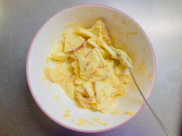 4.りんごを混ぜます。生地が硬いので混ぜにくいのですが、徐々にりんごの水分で均一に混ざります。