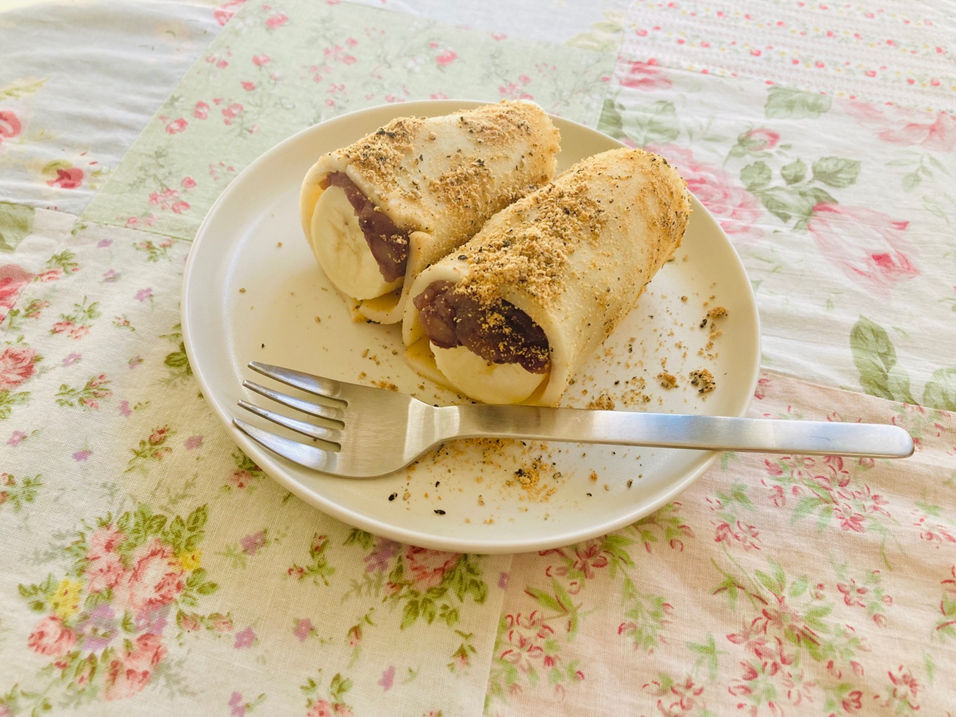 3.きな粉を振っておいたまな板などに置いて、あんことバナナを乗せてくるっと巻きます。半分にカットしてお皿に盛り付け、上からきな粉を振って完成です。生地が破れやすいので気をつけてください。