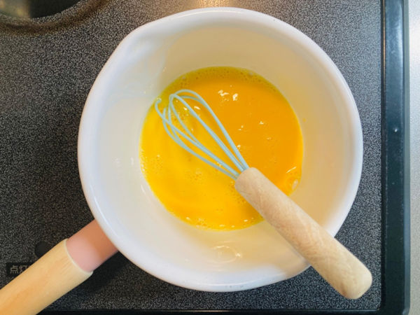 1.鍋に卵を入れて泡立て器でよくほぐします。