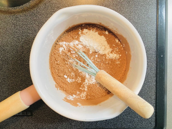 2.豆乳、砂糖、ココアパウダー、米粉を加えてよく混ぜます。ココアパウダーは混ざりにくいですが、あまり気にしなくて大丈夫です。