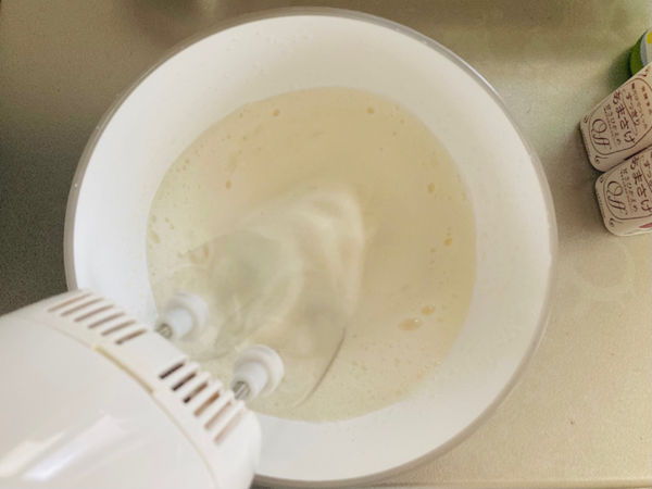 2.レモン汁を加えてさらに泡立てるとクリームぽくなります。