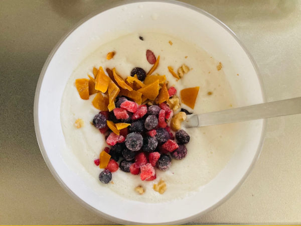 3.甘酒、荒く刻んだミックスナッツ、ドライフルーツ(マンゴーを入れる場合は包丁かキッチンハサミで細かくカットしてください)を加えてさっくりと泡を潰さないように混ぜます。