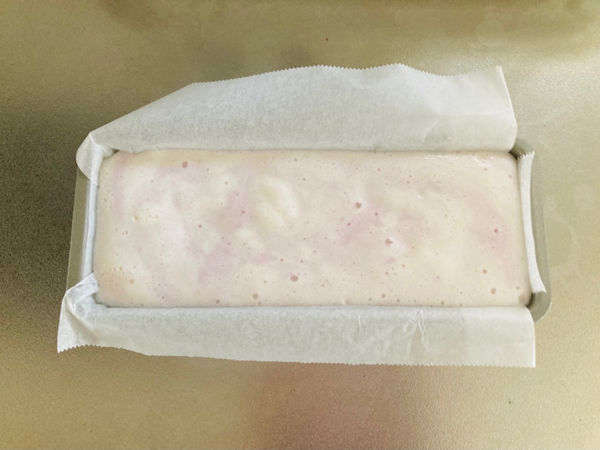 4.クッキングシートを敷いたパウンドケーキの型に入れて軽くラップを被せ、冷凍室で凍らせたら完成です。カットしてお召し上がり下さい。