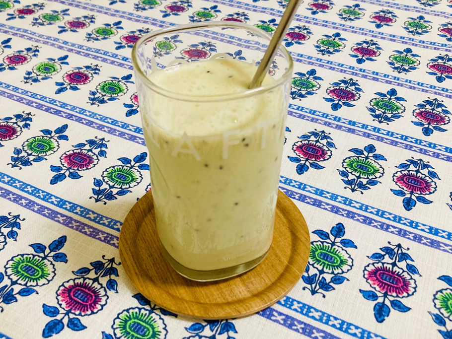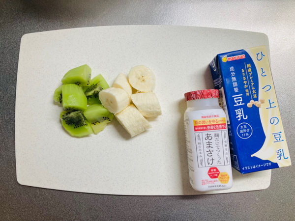 甘酒、豆乳、キウイ、バナナの4つの材料で作る、乳製品不使用、砂糖不使用のスムージーです。