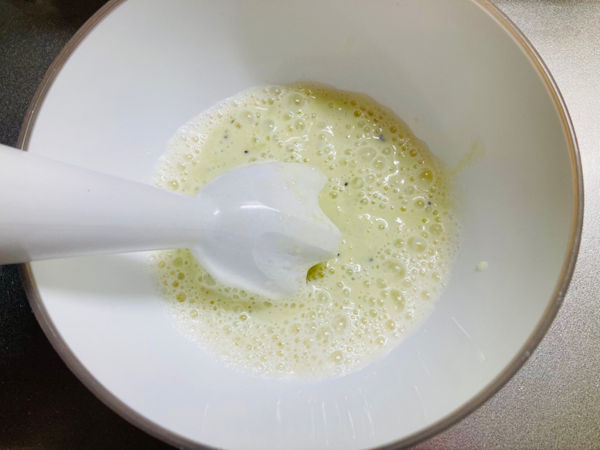 2.材料を全部ミキサーに入れて、なめらかになるまで攪拌して完成です。ミキサーが無い場合はブレンダーを使用しても大丈夫です。(写真はブレンダー)