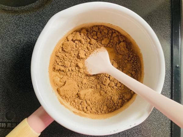1.豆乳、粉寒天、甜菜糖、ココアを鍋に入れて、ゆっくりかき混ぜながら弱火~中火で温めます。