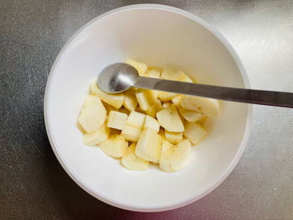 3.バナナは1cm角くらいにカットして、レモン汁をかけて馴染ませます。