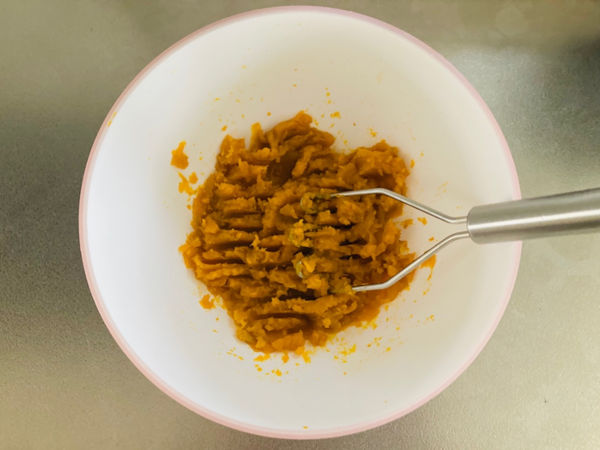 1.カボチャは適当にカットし、レンジ温めるか蒸すなどして柔らかくし、皮を取り除いて潰します。