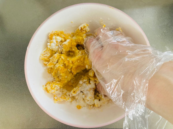 2.米粉、甜菜糖、豆腐を80gくらい加えて、手でこねながら、豆腐の量を少しずつ増やして生地の硬さを調整します。米粉の吸水率やカボチャの水分によって豆腐の量が変わります。