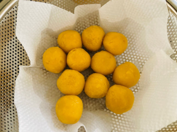 4.沸騰したお湯で茹でます。表面に浮いてきたら更に1分ほど茹でて氷水にとり、キッチンペーパーを敷いたザルで水気を切って完成です。