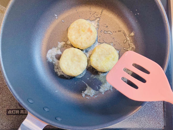 3.3等分して平たく成形し、フライパンで弱火でバターを溶かし、少し押しながら両面を焼いて完成です。
