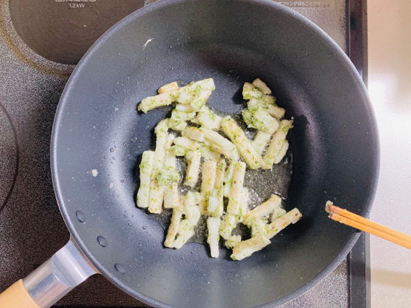 3.ライパンに米油を入れて中火で熱し、長芋を入れて揚げ焼きにします。焼き色がつくようあまりいじらず、焼き色が片面についたら転がすように焼いて完成です。