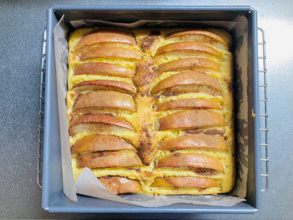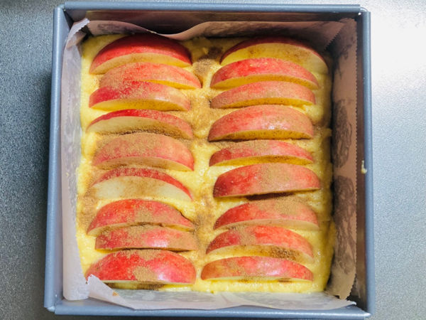 4.ペーパーを敷いた型に流し入れて、お好みの厚みにスライスしたりんごを生地に差し込むように並べ、シナモンを振りかけます。