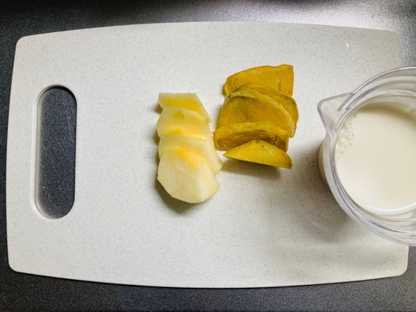 2.ミキサーかブレンダーで、焼き芋、りんご、豆乳、おろし生姜を攪拌します。