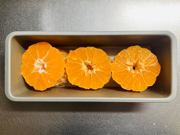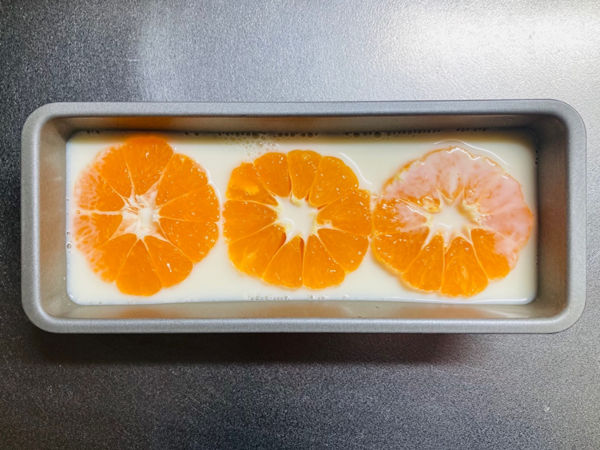 1.みかんの皮を剥いて白いスジを綺麗にとり、半分に切って断面を上下に向くように型に入れます。