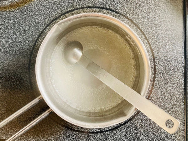 2.鍋に水と粉寒天を入れて、中火でかき混ぜながら沸騰させ、沸騰後数分煮立たせます。