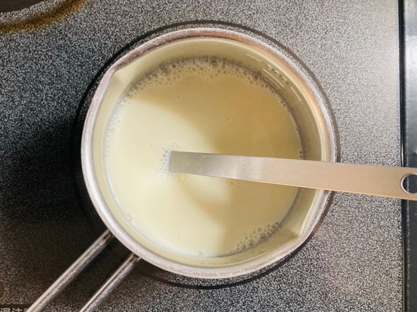 3.火を止めて豆乳、甜菜糖を加えてよく混ぜます。