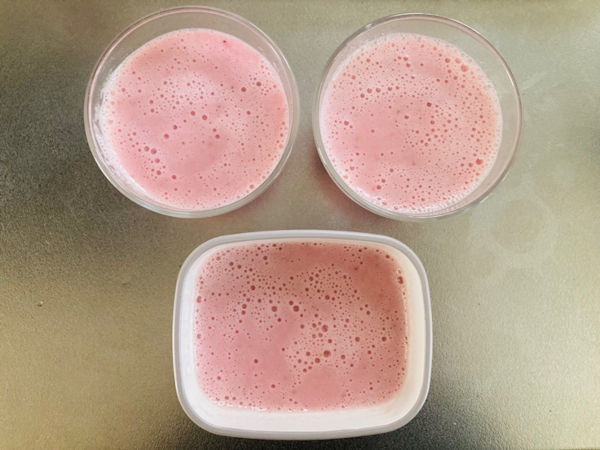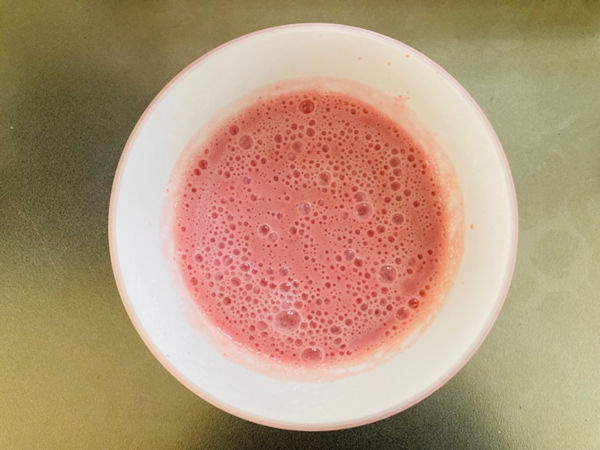 3.100mlの熱湯にゼラチンを加えてよく溶かし、2に加えてよく混ぜます。器に注いで冷蔵庫で冷やし固めて完成です。表面の泡は気になるようでしたら冷やす前に取り除いてください。飾り用いちごで隠すのがオススメです。